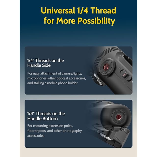 [内蔵リングライト&1/4インチスレッド]スマートフォンジンバルとして、Smart Xは背面に3段階の調整可能なLEDリングライトを備えており、暗闇でも美しさを明るくするように設計されています。 また、マイクや延長ポールなどの写真アクセサリーを取り付けるための、左右に1/4インチの標準スレッドが付いています。 サイドマウントには携帯電話ホルダーが固定され、自撮り棒三脚としてライブストリーミングに便利です。