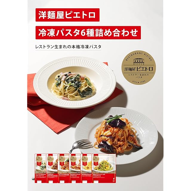 【はじまりは一軒のレストラン】ピエトロのはじまりは1980年に福岡・天神にオープンした一軒のレストラン。ピエトロレストラン人気NO.1の「ベーコンとほうれん草のクリームソース」「糸ひきモッツァレラチーズのトマトソース」など、本格的な味わいをご家庭でも手軽にお楽しみいただけるセットです。 <br><br> 【最高のパスタは最高の小麦から】イタリア各地から集められた14品種のデュラム小麦を「風味」「コシ」「弾力「色」の4項目が最高品質になるようブレンドしたAGNESIを使用しております。 <br><br> 【冷凍パスタでも最高の食感アルデンテ】パスタの最高の食感と呼ばれるアルデンテ。ピエトロ独自の製法により、冷凍パスタで極上の食感を実現しました。ピエトロのパスタ麺が選ばれる理由です。 <br><br> 【国内工場で手づくり】本格的なピエトロレストランの味わいをご家庭でお楽しみいただくため、ピエトロの冷凍食品は「人の手で作る」ことを大切にしています。レストランの厨房で作るのと同じように、丁寧に作った自慢のパスタをぜひご家庭でお楽しみください。 <br><br> 【内容】・ベーコンとほうれん草のクリームソース(290g)・お肉好きのためのあなたのためのボロネーゼ(270g)・なすとひき肉の辛味スパゲティ(290g)・糸ひきモッツァレラチーズのトマトソース(285g)・博多辛子明太子カルボナーラ(265g)・海老とマッシュルームのバジルクリーム(276g)【お召し上がり方】電子レンジで500W:約5分15秒/600W:約4分30秒 ※商品によって異なりますので商品裏面をご確認ください。【賞味期限】製造日から9か月 【保存方法】-18℃以下で保存してください。