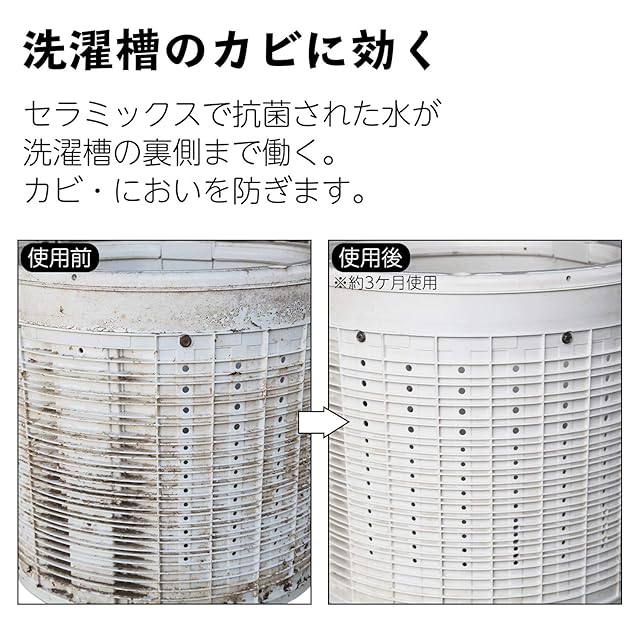 セラミックスの力で洗濯槽の水を除菌。雑菌による洗濯物、洗濯機のニオイヌメリの抑制に