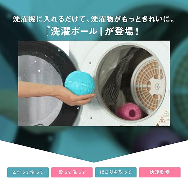 洗濯物をもっとキレイに! ポイント①約4,400本の極細毛が作り出す強力な、洗浄力!極細毛が、あなたの代わりに手洗いしてくれます。 ポイント②柔らかいシリコン素材でできており騒音を立てにくく乾燥機に入れれば、乾燥まで素早く! ポイント③洗剤の量は変わらないのに洗濯ボール一つ入れるだけで洗浄力がさらにUP!長い間繰り返し使えます。 ”72個のエアホールから四方に水を噴き出しながら汚れをしっかり除去!”