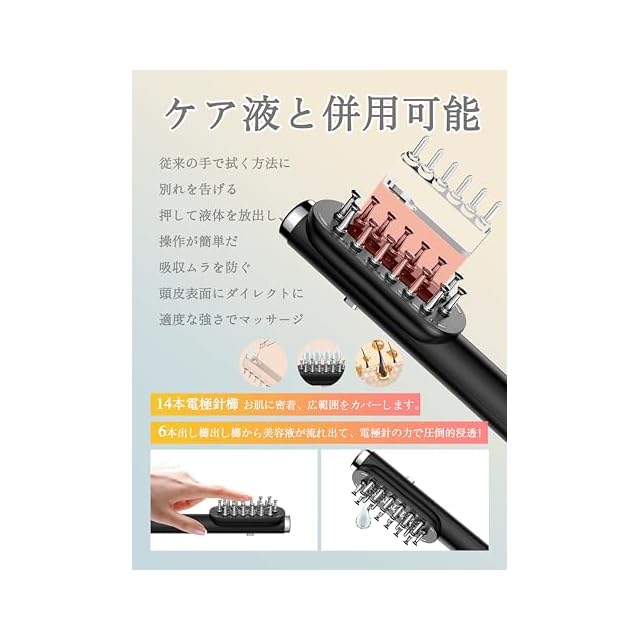 【ケア液と一緒に使用可能】取り外し可能な液体収納ボックスのデザインは、ケアソリューションと一緒に使用できます。 従来の手で塗布する方法とはおさらばです。ベタつかず、とても使いやすく、ワンプッシュで液が出て直接頭皮に塗布できます。均一なマッサージ力で頭皮への栄養の均一な吸収を促します。