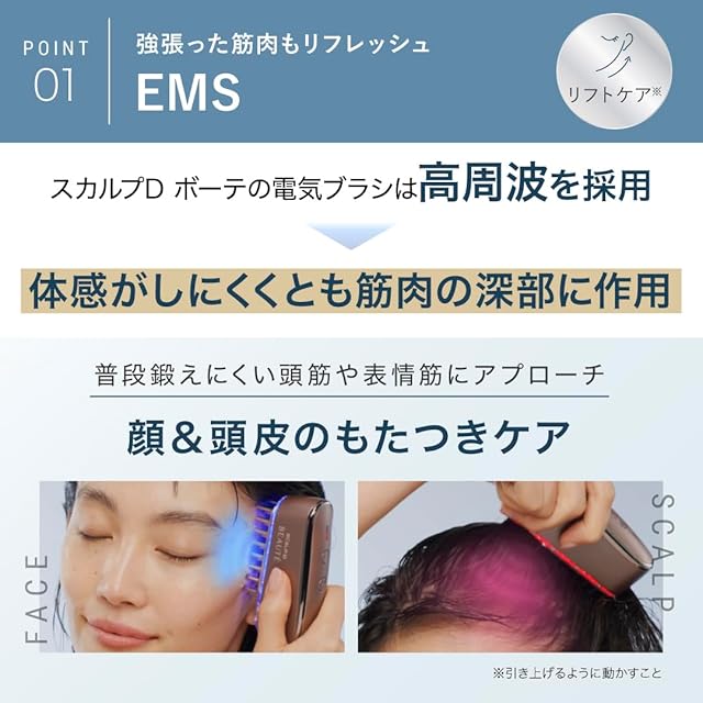 【強張った筋肉もEMSでリフレッシュ】 体感がしにくくとも筋肉の深部にする高周波を採用。 普段鍛えにくい頭筋や表情筋にアプローチし、顔&頭皮のもたつきをケア。