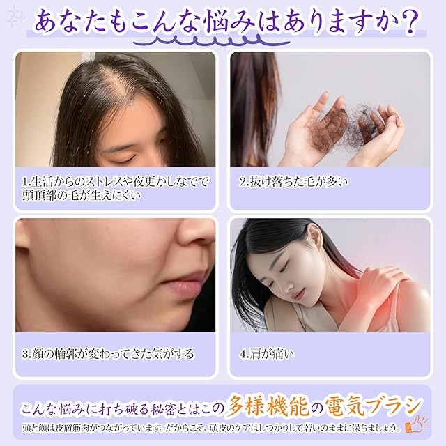 「3色LEDライトで快適な」:こちらの電気ブラシはLEDを22個搭載し、レッド、ブルー、オレンジの3種類のLEDライトがあり、お肌をやさしくケアします。660nmの赤色LEDは頭皮の環境を改善します。460nmのブルーLEDは皮脂のバランスを整え、頭皮を清潔に保ちます。590nmのオレンジLEDは頭皮をケアします。頭皮状態に合わせて選べ、広範囲にLED光を届け、頭皮に効果的にアプローチ。<br>「EMS微電流・振動モード」:ヘッドブラシはEMS微電流技術を導入し、16本の電極針から頭皮に合うEMSを出力して、頭皮に優しい刺激を与え、日常的なスカルプケアをサポートします。また、振動モードがあり、電動頭皮ブラシが硬くなった頭皮や肌をほぐします。三つの違うEMS波形と違う振動モードガあり、お好みに合わせて調整できます。<br>「液体ケース付き」:頭皮ブラシは5本の導液針を搭載しており、液体ケースに美容液や剤などを注入し、ワンプッシュで液体を均等に出し、従来の手で塗布する方法により快適です。EMSモードや振動モードに組み合わせると、美容液成分の浸透をサポートし、より効果的なケアを実現します。<br>「持ち運びに便利・多様なシーンに対応」:電気ブラシは手のひらに収まるサイズで、家庭内はもちろん、バッグに入れて持ち運びも簡単です。Type-C充電対応なので、オフィスや旅行先でも手軽に充電でき、自由に使えます。多機能の組み合わせで、頭皮や肌の全方位ケアを提供します。日常のケアアイテムとしてはもちろん、家族や友人への完璧なプレゼントとしても最適です。<br>「品質&パッケージ内容」:ご購入日より1年間のをいたします、商品に問題があった場合は、販売店までご連絡いただきますと、迅速に対応させていただきます。パッケージ内容:電気ブラシ×1、充電ケーブル×1、日本語取扱説明書×1