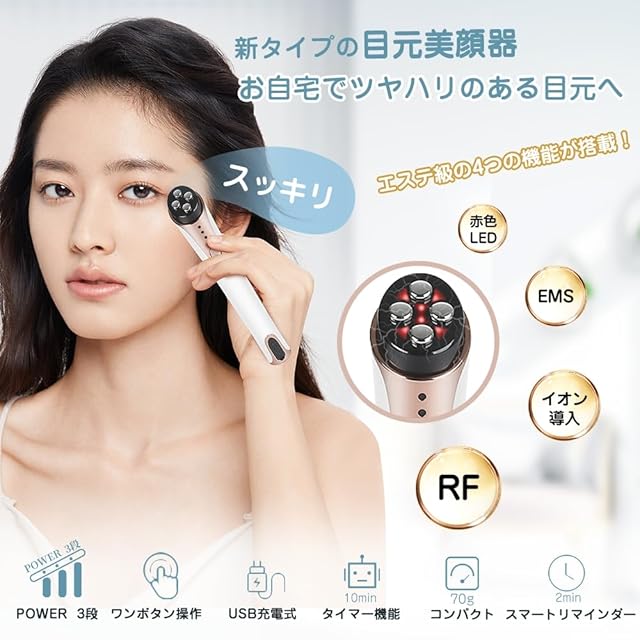 <br> 目元に悩む全ての方が待ち望んだ目元ケア美顔器です。 <br> これ一台で、惹きつけられる目元に! <br> 人の第一印象は「顔」が大きな割合を占めていますが、その中でも特に「目元」は重要な部分です <br> 一目惚れは目が合うことから始まります! <br> でも、日常生活の中で、いろんな目元の悩みがありますよね。 <br> 鏡を見るたびに気になる... <br> 二重の幅が狭くなったり、まぶたが下がって目が小さく見えるが嫌.. <br> 明るい目が欲しい.. <br> 「美魔女」呼ばれたい.. <br> そんな方にEMS目元美顔器をおすすめ! <br> 気になる目元のお悩みをでお手軽に目元ケア! <br> RF高周波がお肌の奥からじんわりに温かめ <br> EMS で表情筋を鍛えて、効率よく引き上げ て、スッキリとした目元に導く <br> イオン 導入の力で化粧品の美容成分ス一ッと肌に馴染むさらりとした浸透力アップ <br> 赤色LED を照射することで、気になる年齢肌に アプロ一チ、キメを整えて目周りの肌を透き通るようになる! <br> 気になる方は是非お試してみてください。<br> <br>【関連キーワード】美顔器 目の下 美顔器 目元 目元ケア 目元ケア 美顔器 目元美顔器 美容家電 目元エステ 母の日 プレゼント 超軽量 目もと集中ケア まぶた 引き上げ 目元ハリ 目元潤い<br><br>【注意事項】<br> <br>●使用前に必ず化粧水や美容液等をお肌につけて、プレテストをしてください。 <br>■以下の状態の方はご使用にならないでください。 心臓病、伝染病、がん、大きい切り傷がある状態、急性疾患、低血圧、高血圧、神経過敏、ペースメーカーが入っている状態、人工心臓または肺臓をお持ちの方、皮膚疾患、過度な日焼け後、妊娠している可能性のある方、授乳中の方 <br>■ご使用を避ける必要がある箇 <br>切り傷・擦り傷、骨や関節の上、整形箇所、声帯箇所、眼球