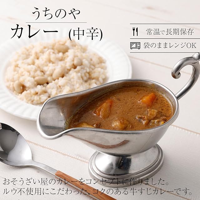 うちのやカレー(中辛):エネルギー112kcal、たんぱく質 8.4g、脂質2.2g、炭水化物16.4g、食塩相当量2.6g ※この表示値は目安です。