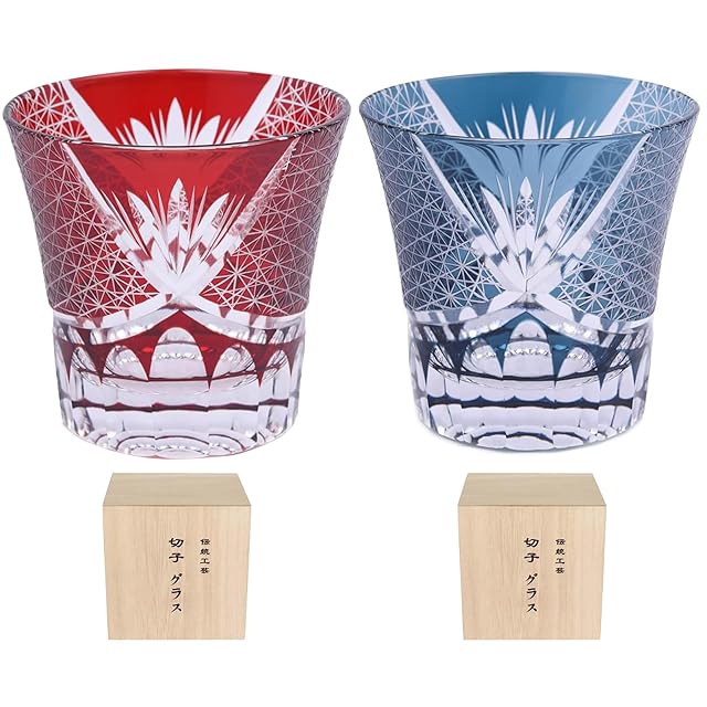 MGOXO 切子 グラス 日本酒グラス 260ml 菊つなぎ 文様 ロック 焼酎グラス 退職祝い 結婚祝い 父の日 母の日 ペアギフト 古希 喜寿 上司 昇進 お祝い(赤+青)