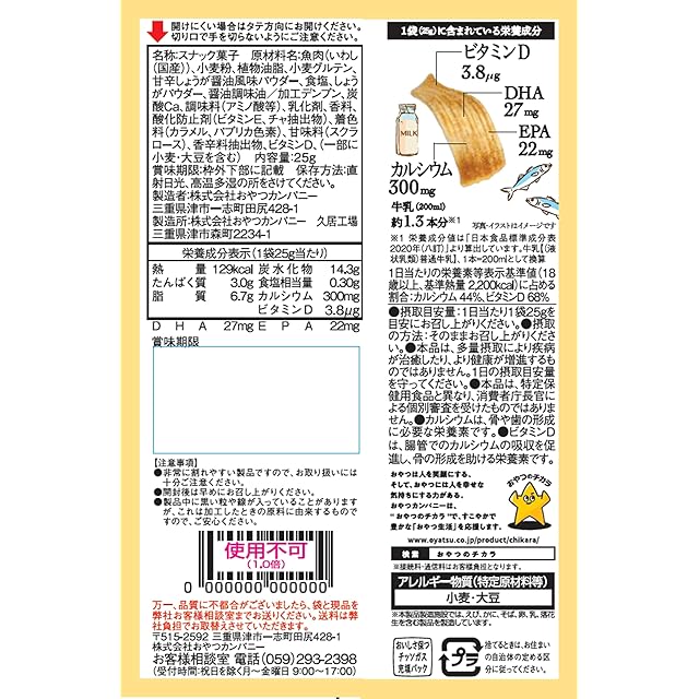 1袋あたりカルシウム317㎎、ビタミンD4.1μg、DHA73㎎、EPA54㎎が接種できます。 育ち盛りのお子様のおやつにもぴったりです。