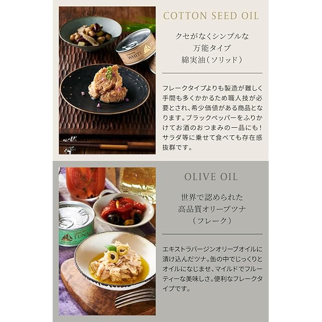 【こだわり抜いた贅沢なツナ缶セット】世界で流通している80%以上のツナ缶原料はカツオが使われていますが、オーシャンプリンセスのツナ缶はおいしさを追求し、最高級とも言われる「びん長まぐろ」を使用しております。さらに油や製法にもこだわった人気の6種類のツナ缶をセットにしました。