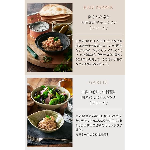 【商品詳細】原材料・成分: びんながまぐろ、オリーブ油、綿実油、野菜スープ、食塩、たんぱく加水分解物、にんにく、とうがらし、香辛料抽出物、野菜エキス、トマトペースト、増粘剤(グアーガム)容量:1缶90g[綿実油ツナ(フレーク)/綿実油ツナ(ソリッド)/オリーブオイルツナ(フレーク)/オリーブオイルツナ(ソリッド)/国産にんにく入りツナ(フレーク)/国産赤唐辛子入りツナ(フレーク)] / 常温で保存してください。賞味期限は製造から3年です。