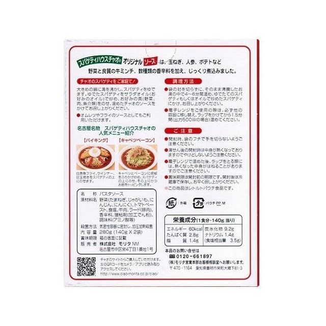 名古屋名物「スパゲティハウスチャオ」のオリジナルソースは、玉ねぎ・人参・ポテトなどたっぷりの野菜と良質の牛ミンチ、数種類の香辛料を加え、じっくり煮込みました。 ◎内容 パスタソース1箱(140g×2袋) ◎原材料 たまねぎ、じゃがいも、にんじん、にんにく、、トマトペースト、食塩、牛肉、ラード、香辛料、増粘剤(加工でん粉)、調味料(アミノ酸等) ◎アレルギー特定原材料 ◎賞味期限 賞味期限:箱、袋に記載。(製造後1年) ◎保存方法 保存方法:直射日光、湿気を避け、常温で保存してください。