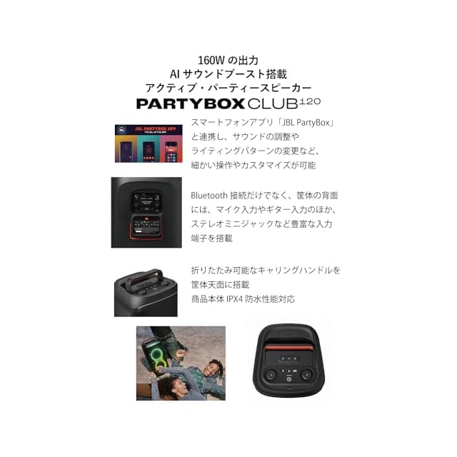 商品名:JBL PartyBox Club 120 Bluetoothスピーカー ワイヤレス 160W出力/IPX4/マイク入力/ギター入力搭載/ブラック JBLPBCLUB120JN
