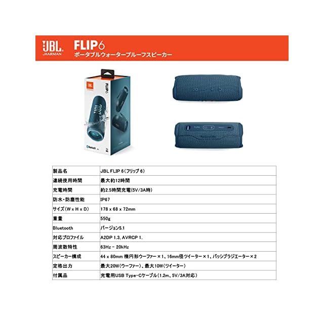商品名:JBL FLIP6 Bluetoothスピーカー 2ウェイ・スピーカー構成/USB C充電/IP67防塵防水/パッシブラジエーター搭載/ポータブル ブルー JBLFLIP6BLU