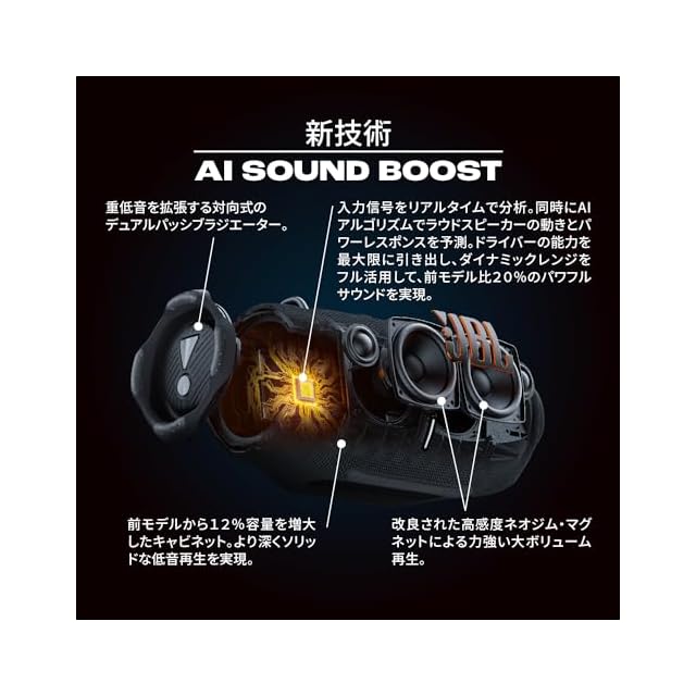 JBLが展開するポータブルBluetoothスピーカーの最高ランクを誇る「XTREME」シリーズより、新次元のAIアルゴリズム・テクノロジー「AI Sound Boost」を搭載し、かつ耐久性とポータビリティの向上を実現して進化した最新モデル「JBL XTREME 4」。 スピーカーを最大限に駆動する新開発の「AI Sound Boost」と、さらに強化されたドライバーとアンプ部によって、これまでにない新次元のパワフルサウンドを実現しています。また、存在感のあるサイズでありながら付属の耐久性の高いショルダーストラップで、どこへでも手軽に持ち運ぶことが可能です。ボディーには衝撃吸収のためのバンパーをサイドと底面にも装備し、耐久性をさらに高めています。 機能面では、本モデルより新たにLE Audioに対応。最新の「Auracast」機能で、JBLの対応機種との接続性・拡張性がさらに広がります。