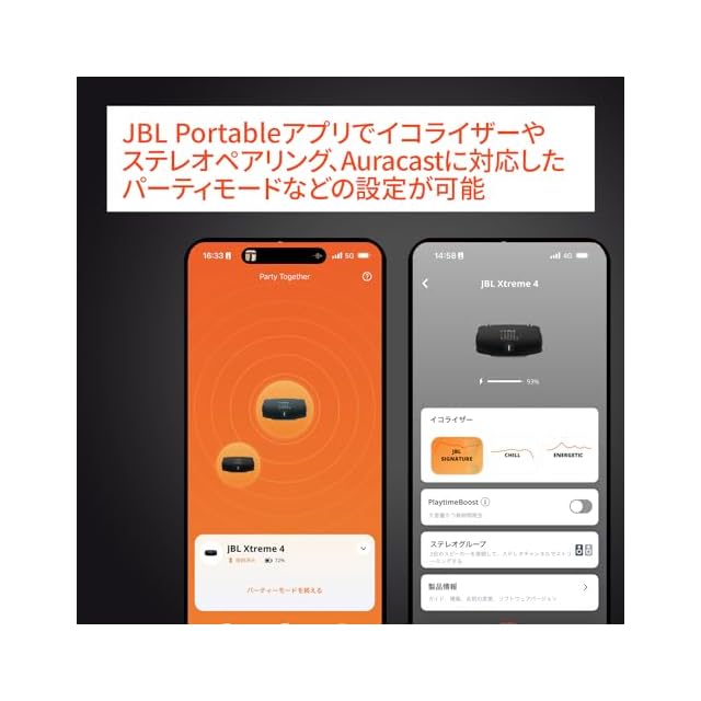 「JBL Portable」アプリで、接続する複数の機種の一元管理や同機種のステレオペアリングなどの設定可。