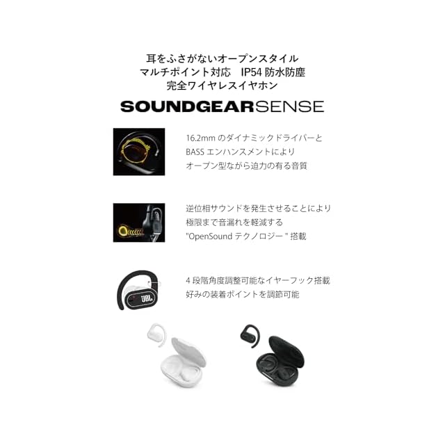商品名:JBL SOUNDGEAR SENSE 完全ワイヤレスイヤホン/オープンイヤー/マルチポイント/IP54防水/Bluetooth5.3/耳を塞がない/音漏れ防止/ブラック/JBLSNDGEARSNSBLK
