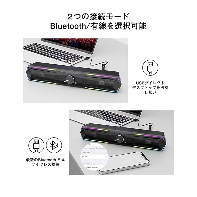 【2つの接続方法】 Kstime PCスピーカーには、Bluetooth 5.4とUSBケーブルの2つ接続方法があります。タブレット、スマートフォン、ラップトップ、PS4、Switch、MP3、MP4、IPODなど幅広いデバイスと互換性があります。