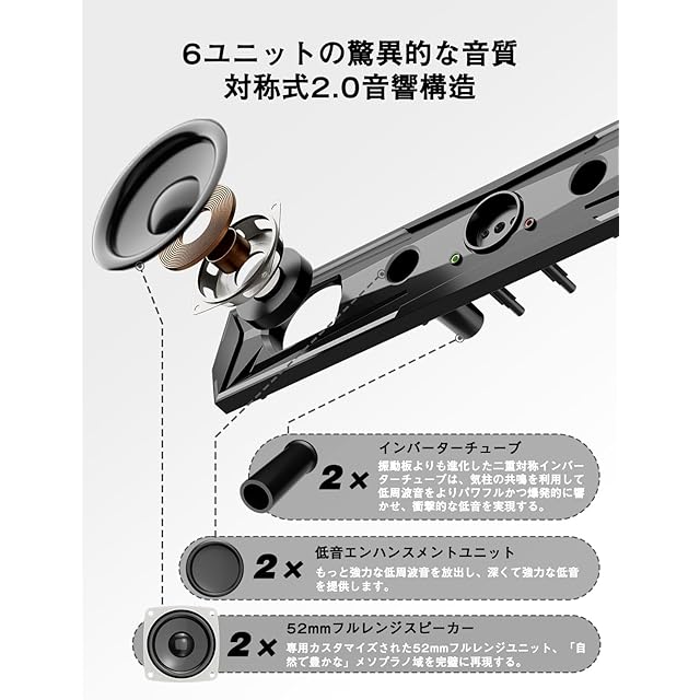 【6ユニットの驚異的な音質】KstimeのPCサウンドバーは、2つのフルレンジスピーカーと2つ低音エンハンスメントユニットと2つインバーターチューブを採用して、最新の二重インバーターチューブ音響システムの技術の応用と先進的対称キャビティな設計により音楽、ゲームやビデオがより楽しくに再現します。音質は臨場感があり、どの音量でも驚くほどの明瞭さと優れた低音を実現します。