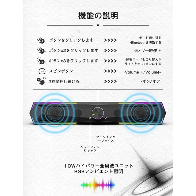 商品名:Kstime【最新Bluetooth5.4 & USBダイレクト】PCスピーカー サウンドバー 10W RGB ゲーミングスピーカー 六つのスピーカーユニット 二重対称インバーターチューブ ステレオ 大音量&豊かな低音 ラップトップ、タブレット、スマートフォンに対応、USB給電式のパソコンスピーカー