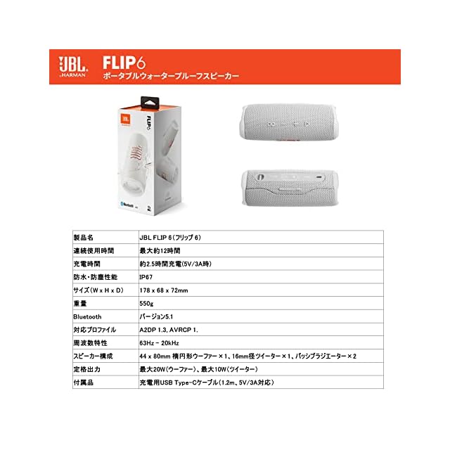 商品名:JBL FLIP6 Bluetoothスピーカー 2ウェイ・スピーカー構成/USB C充電/IP67防塵防水/パッシブラジエーター搭載/ポータブル ホワイト JBLFLIP6WHT