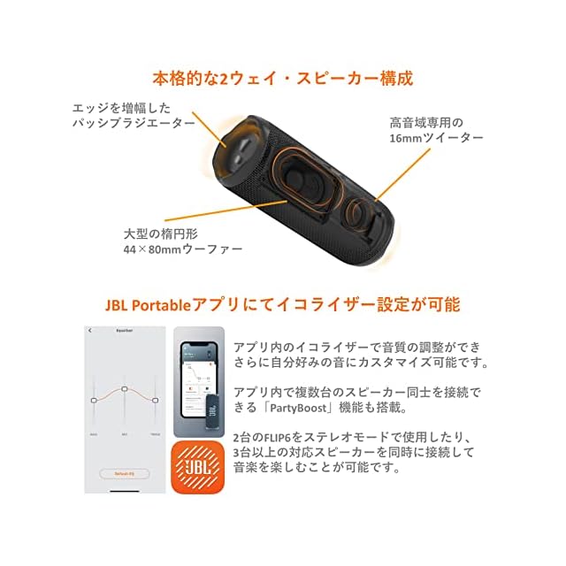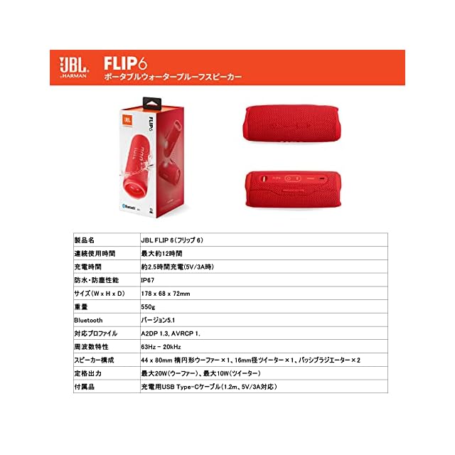 商品名:JBL FLIP6 Bluetoothスピーカー 2ウェイ・スピーカー構成/USB C充電/IP67防塵防水/パッシブラジエーター搭載/ポータブル レッド JBLFLIP6RED