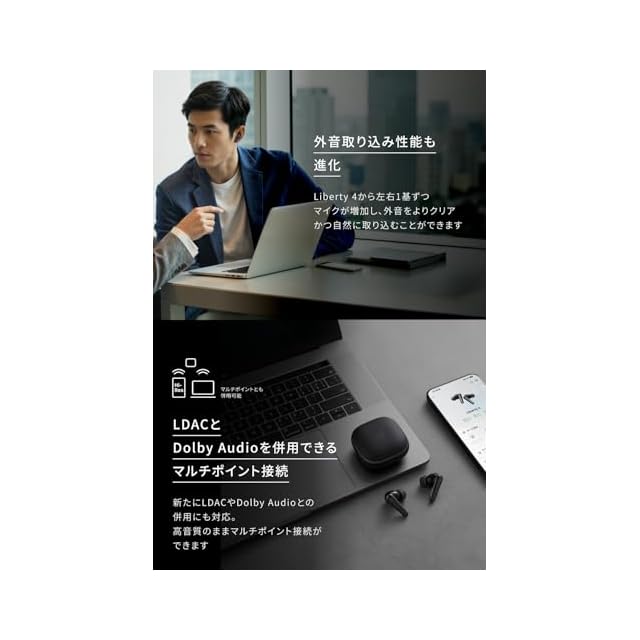 進化したウルトラノイズキャンセリング3.5:Liberty 4のウルトラノイズキャンセリング 2.0から、ウルトラノイズキャンセリング 3.5に進化。環境に左右されず様々なシーンで圧倒的な静けさと没入感を提供します。