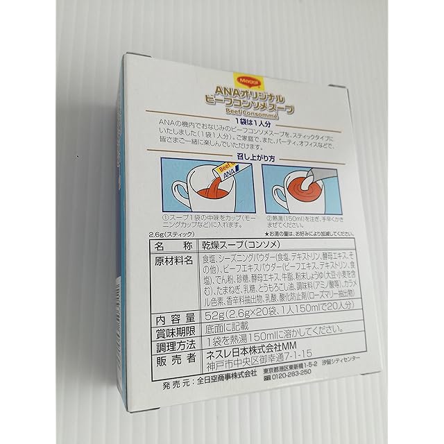 快適な空の旅を楽しんで頂くために、ANA機内サービスでお出ししているオリジナルのコンソメスープ!! <br>牛肉の風味をいかしたエキスに、野菜の旨みをプラスしたコクのある味わいで、誕生以来、多くの方に親しまれています。 <br>溶けやすい顆粒状のスティックタイプなので、一人分のカップで簡単にお召あがりいただけます。 <br>スープ以外にもお料理の かくし味として、チャーハンや煮込み料理などに加えれば風味豊かな味に仕上がります。