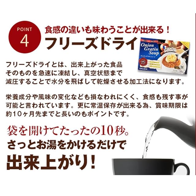 商品名:【公式 人気商品 】 オニオングラタンスープ 10食 セット オリジナルレシピ付★ ピルボックス PILLBOX フリーズドライ スープ オニオンスープ カップスープ 詰め合わせ 非常食 インスタントスープ 箱無し (オニオングラタン 10包) たまねぎスープ 玉ねぎスープ インスタント食品 即席スープ