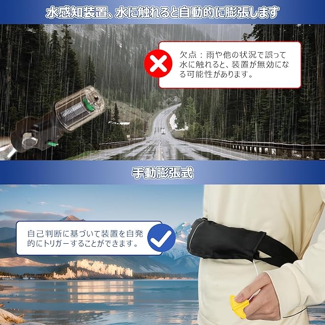 【手動充気式・迅速膨張】手動充気タイプで、ロープを操作すると約5秒で迅速に充気できます。海上 で波に打たれたり、足場を失い転倒したりするなどによる溺水から命を守ってくれ、初心者から上級ユーザ ーまで楽々にご利用頂けます