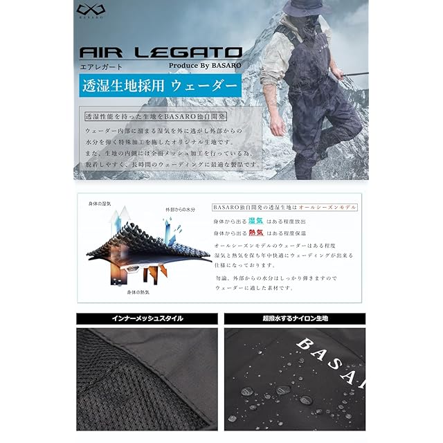 透湿性のあるBASAROアクティブナイロンを使用したウェーダーです。透湿性を上げすぎると防水性が損なわれる為、ある程度の透湿性を持たせた防水ツールです。どの様な体格の方でも着心地が良い様に生地を立体裁断し縫製しておりますので、長時間のウェーディングでも疲れにくい事が大きな特徴です。またウェーダー内部はインナーメッシュを搭載しておりますので、脱ぎ着もストレスなく行う事が可能です。 BASAROアクティブナイロンは非常に撥水性能も高いので持ち運ぶ際の水滴等はサッと払うだけで落とす事ができます。ソールタイプはラジアル/フェルトをご用意しております。ブーツサイズ S:24-25.5cm M:26-27.5cm L:27.5-29cm XL:29-30cm XXL:30-33cmをご用意しております。基本的にウェーダーはブーツサイズでお選び頂く事をお勧めしております。