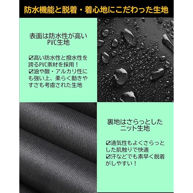 ✅【防水性と着心地にこだわった生地】 表地はPVC・裏地はニット生地を使用しており防水性とともに中の湿気を可能な機能性素材。表地は高い耐水性・撥水性と油や酸・アルカリにも強く防寒性もあり、柔らかく動きやすさも考慮された生地。裏地のニット生地は蒸れにくく、さらっとした肌触りで素早く脱着が可能。多少気温が高くとも快適に使用する事ができます。