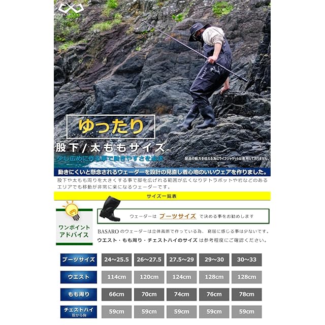 ࿇特徴:BASARO製のウェーダーは動きやすい事が大きな特徴となります。これは様々なメーカーのウェーダーを参考にし水中内で窮屈に感じる部分を少し大きめに設計している事で動きにくさ、窮屈さを改善しております。またカタログにも掲載しておりますが、ウェーダーを着用しながらの岩場やテトラの移動もラクラクできる様に股下を大きく設計しております。ご自身の動きやすいサイズを決める場合はメーカースタッフの試着感想をカタログ最下部に掲載しておりますので、ご参考ください。