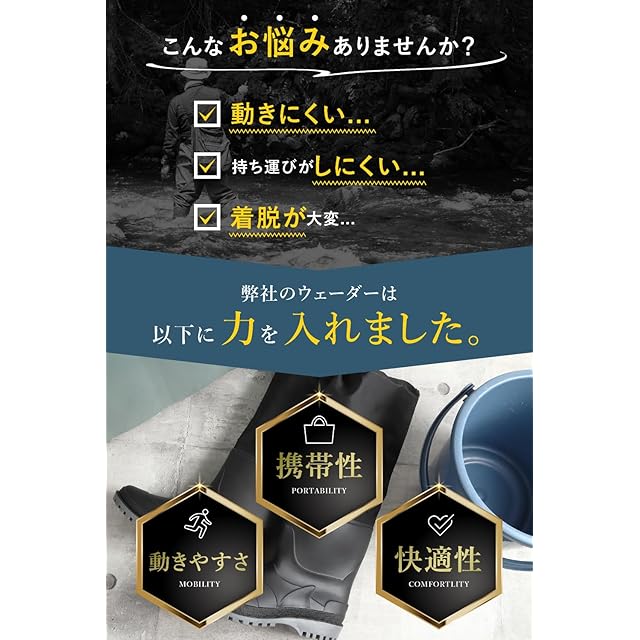 商品名:unizom ウェーダー 【専門家推奨 新聞掲載】 釣り ながぐつ 作業用 完全防水 丈夫 軽量 防災 農作業 メンズ レディース 折りたたみ 長靴 ひざ下 胴長 ニーブーツ (ブラック, 27.5㎝~28cm)