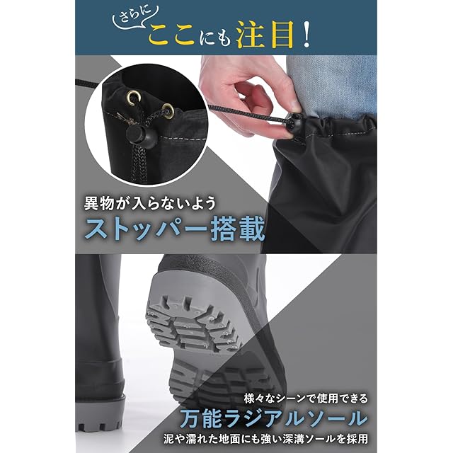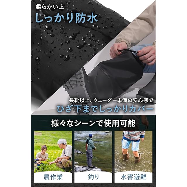 【ひざ下まで防水】長靴以上ウェーダー未満。水深30cm程度に対応し、軽作業や釣り、防災にも最適。