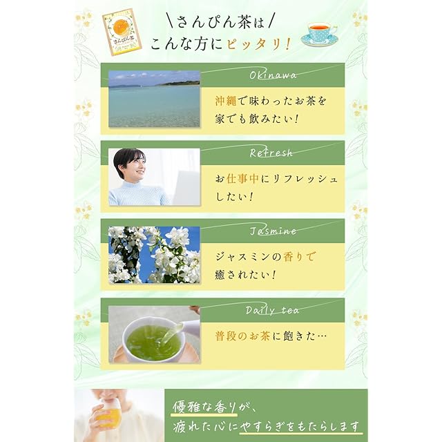 【 ジャスミン 香る、心地よいひととき】 さんぴん茶 は一口飲むとほんのり甘くて ジャスミン の香りが広がり、渋みも少なくすっきりとした味わいです。