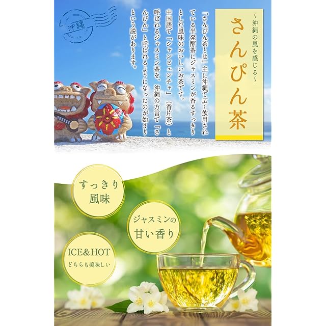 さんぴん茶 は一口飲むとほんのり甘くて ジャスミン の香りが広がり、渋みも少なくすっきりとした味わいです。 沖縄のお茶と言えばこれ! さんぴん茶 は ジャスミン茶 とよく似たお茶ですが、沖縄では 緑茶 よりもよく飲まれているそうです。Choitomoの さんぴん茶 で、沖縄の情景がよみがえるかも!? さんぴん茶 とは中国語で「 ジャスミン茶 」を指す言葉の「シャンピェンチャー」(香片茶)が由来と言われています。 さんぴん茶 に使用されている茶葉は半発酵茶で主に 烏龍茶 をベースとして作られていて、 ジャスミン茶 に使用されている茶葉は不発酵茶で主に 緑茶 をベースとして作られています。 お茶の本場、中国福建省で製造された茶葉を輸入し、残留農薬検査の上、沖縄の老舗茶屋で加工、最終検品をきっちりと行っております。