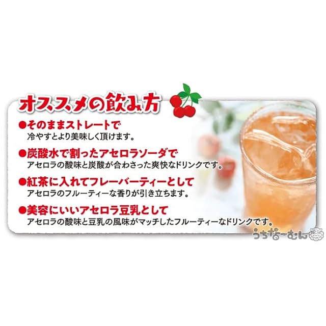 そのままお召し上がりいただく他、炭酸水で割ったりハチミツを加えたりと、お好みに合わせて美味しく栄養補給が可能。 アセロラの果実の甘酸っぱさと、ほのかな甘みをお楽しみください。