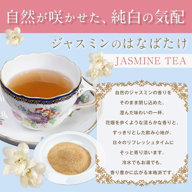 【ジャパン・フード・セレクション グランプリ受賞】<br> 食のプロが審査する日本最大級の食品評価制度「ジャパン・フード・セレクション」にて、当商品『ジャスミンティー』がグランプリを受賞!<br> 忙しい毎日でも、お湯を注ぐだけで広がる本格的な味わいと華やかな香りが高く評価されました。<br> 自分へのご褒美に、大切な方への贈り物に、ぜひこの一杯を。<br><br> 【自然が咲かせた、純白の気配】<br> 自然のジャスミンの花をそのまま閉じ込めた、清らかで澄んだ味わいの一杯です。花畑を歩くような可憐な香りと、すっきりとした飲み心地が、忙しい日常にそっと寄り添い、ほっとする時間をお届けします。冷水でもお湯でも香り豊かに広がり、本格的な味わいを手軽にお楽しみいただけます。<br><br> 【香料不使用。花本来の自然な香りを堪能】<br> 香料に頼らず、自然なジャスミンの香りだけを使用<br><br> 透き通るような清潔感と、やさしい余韻が魅力<br><br> お湯でも冷水でもさっと溶ける、便利な即溶タイプ<br><br> 花の香りに包まれる華やかさと、清々しい後味が調和<br><br> 華やかな香りを楽しむタイプと、茶葉本来の旨みを引き出すシンプルタイプの両方を大切に、素材本来の風味を活かす製法にこだわりました。<br><br> 【いつでもどこでも、心を整える一杯を】<br> 忙しい日々に、手軽に淹れられる粉末タイプ<br><br> お湯や冷水にさっと溶け、時間や場所を問わず楽しめる<br><br> ご家庭用にもギフトにもふさわしい、洗練されたパッケージ<br><br> 【安心・安全の品質管理】<br> 中国産茶葉を使用し、中国HACCP基準に準拠した工場で製造<br><br> 製造過程での殺菌工程と厳格なトレーサビリティ管理<br><br> 厚生労働省基準(粉末清涼飲料基準)を満たした安全品質<br><br> 環境にやさしい、茶殻が出ない仕様<br><br> 【お召し上がり方・ラインナップ】<br> 1杯(100ml)あたり:粉末0.5gを溶かしてお楽しみください。<br><br> 50gと100gの2サイズ展開で、暮らしに合わせてお選びいただけます。<br><br> 【こんな方におすすめ】<br> 忙しい中でも、自然の香りで心を癒したい方<br><br> 香料に頼らない本物の香りと味わいを楽しみたい方<br><br> 家事や育児、仕事の合間に、さりげない贅沢を感じたい方<br><br> 自然のジャスミンの香りが、何気ないひとときにそっと寄り添い、上質なリフレッシュタイムを演出します。日々の暮らしに、清らかな香りの贅沢をお届けします。