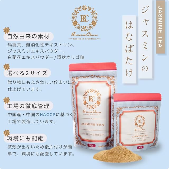 【ブランドの代表商品がジャパン・フード・セレクション グランプリ受賞】<br> 食の専門家が選ぶ日本最大級の食品評価制度「ジャパン・フード・セレクション」にて、当ブランドのジャスミンティー(50gサイズ)がグランプリを受賞しました。<br> 華やかな香りと本格的な味わいはそのままに、大容量100gタイプをご用意。<br> ご家庭での常備用や、来客時にもぴったりのサイズです。<br> <br> ※本商品(100gサイズ)は審査対象ではございませんが、受賞商品と同一原料・製法で製造されています。<br> 【自然が咲かせた、純白の気配】<br> 自然のジャスミンの花をそのまま閉じ込めた、清らかで澄んだ味わいの一杯です。花畑を歩くような可憐な香りと、すっきりとした飲み心地が、忙しい日常にそっと寄り添い、ほっとする時間をお届けします。冷水でもお湯でも香り豊かに広がり、本格的な味わいを手軽にお楽しみいただけます。<br><br> 【香料不使用。花本来の自然な香りを堪能】<br> 香料に頼らず、自然なジャスミンの香りだけを使用<br><br> 透き通るような清潔感と、やさしい余韻が魅力<br><br> お湯でも冷水でもさっと溶ける、便利な即溶タイプ<br><br> 花の香りに包まれる華やかさと、清々しい後味が調和<br><br> 華やかな香りを楽しむタイプと、茶葉本来の旨みを引き出すシンプルタイプの両方を大切に、素材本来の風味を活かす製法にこだわりました。<br><br> 【いつでもどこでも、心を整える一杯を】<br> 忙しい日々に、手軽に淹れられる粉末タイプ<br><br> お湯や冷水にさっと溶け、時間や場所を問わず楽しめる<br><br> ご家庭用にもギフトにもふさわしい、洗練されたパッケージ<br><br> 【安心・安全の品質管理】<br> 中国産茶葉を使用し、中国HACCP基準に準拠した工場で製造<br><br> 製造過程での殺菌工程と厳格なトレーサビリティ管理<br><br> 厚生労働省基準(粉末清涼飲料基準)を満たした安全品質<br><br> 環境にやさしい、茶殻が出ない仕様<br><br> 【お召し上がり方・ラインナップ】<br> 1杯(100ml)あたり:粉末0.5gを溶かしてお楽しみください。<br><br> 50gと100gの2サイズ展開で、暮らしに合わせてお選びいただけます。<br><br> 【こんな方におすすめ】<br> 忙しい中でも、自然の香りで心を癒したい方<br><br> 香料に頼らない本物の香りと味わいを楽しみたい方<br><br> 家事や育児、仕事の合間に、さりげない贅沢を感じたい方<br><br> 自然のジャスミンの香りが、何気ないひとときにそっと寄り添い、上質なリフレッシュタイムを演出します。日々の暮らしに、清らかな香りの贅沢をお届けします。