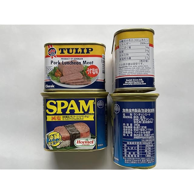 内容量:340g×2缶+250g×2缶 パケージ重量1.37kg 賞味期限:缶表に記載(スパムは裏面に)