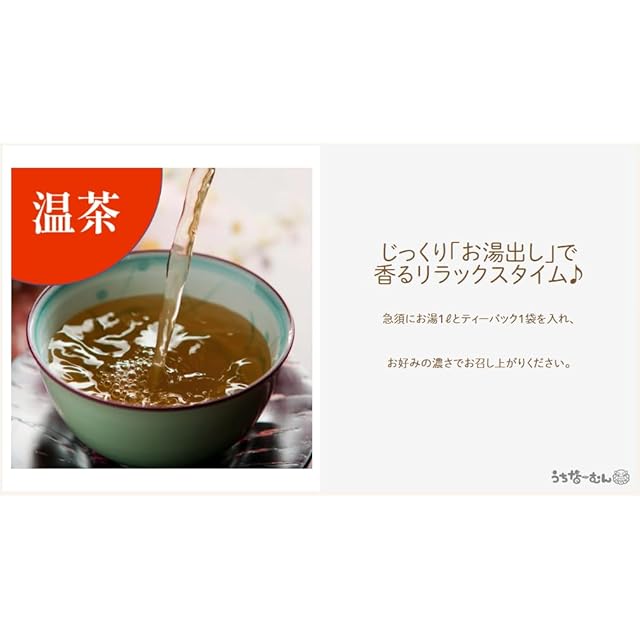 【お召し上がり方】◆水出しの場合:①1Lの水にティーバッグ1袋を入れ、冷蔵庫に入れます。②冷蔵庫で約4~5時間冷やし、ティーバッグを取り出してからお召し上がりください。 ◆お湯出しの場合:急須にお湯1Lとティーバッグ1袋を入れ、お好みの濃さでお召し上がりください。