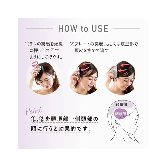 【熱伝導カッサ スカルプの使い方】6つの突起を頭皮に押し当て回すようにしてほぐします。プレートの突起もしくは波型部で頭皮を撫でて流します。頭頂部、側頭部の順に行うと効果的です。
