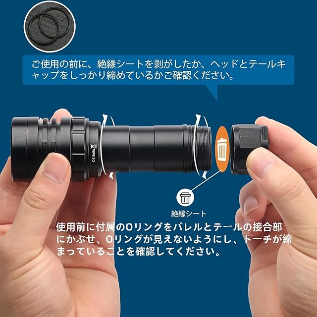 【注意事項とサポート】ご使用前に、絶縁シートを取り除き、ヘッド部やテールキャップがしっかり締まっていることを確認してください。ご質問やサポートが必要な場合は、いつでもお気軽にお問い合わせください。