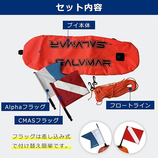 【用途】 スピアフィッシング、魚突き、ダイビング、潜水活動、潜水中、水中作業、潜水作業、船舶など【フラグ交換について】ダイビングフラグ(赤/白)、アルファフラグ(青/白)の各旗が付属されております。棒付きなので、用途に応じて簡単に取り外しと設置が可能です。※旧タイプの商品では、棒付きダイビングフラグ(赤/白)、棒なしアルファフラグ(青/白)となります。取付方法につきましては、販売店までご連絡くださいませ。