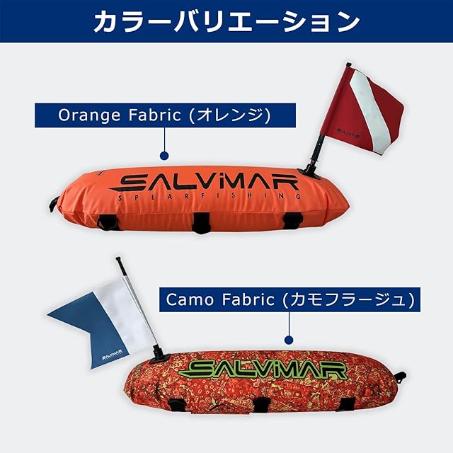 【商品詳細】メーカー:Salvimar(サルビマール)/ 形状:魚雷型シップフロート(フラッグ付き)/ カラー:オレンジ、カモフラージュ(2色展開) / 材質: ナイロン(ヘビーオンス) / サイズ:84cm×26cm / 重さ:約420g(フラグ1本、フロートライン無しの状態) / 付属品:2フラッグ(赤・青)、フロートライン付き(約15m)※Salvimar社が予告なく、商品デザインやカラーの一部変更をする事があります。
