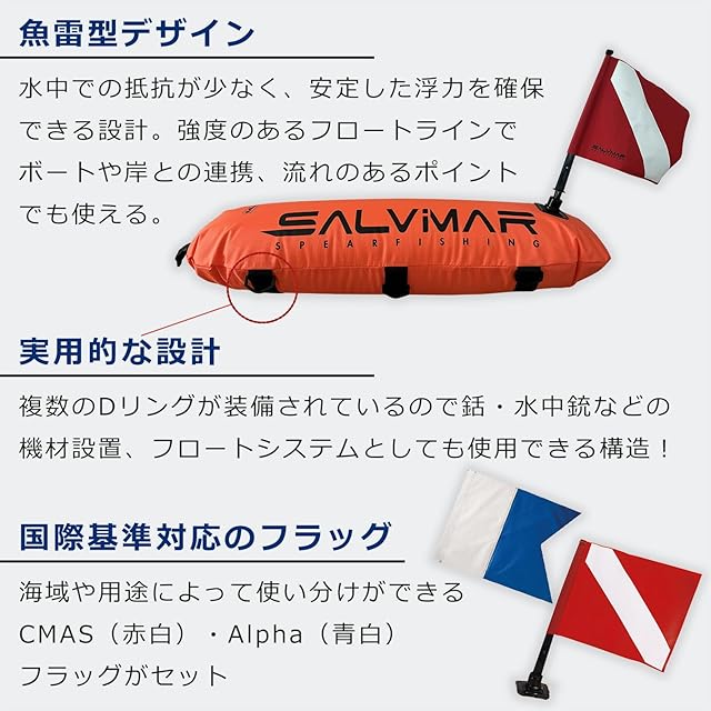 【水の抵抗を考えたsalvimar独自の設計】<br> こちらの魚雷型トピードブイは、水の抵抗を最小限に抑えた設計となっております。海上でも見つけられやすい視認性の高いオレンジカラーを採用しております。新色カラーとしてカモフラージュデザインのオレンジタイプも登場。salvimarならではの独特なデザインとなっております。<br><br> 【海上の障害物にもしっかりと対応出来る構造】<br> ブイ内部にはPVCインナーチューブが入っており、外側は420Dナイロンカバーを使用しており、二重構造タイプなので、とても丈夫で破れにくいです。岩場への衝突へも対応ができて耐久性は抜群です。海での使用時以外は、エアー(空気)を抜けばコンパクトに収納できて、お出かけや遠征時の携行に最適です。海上での休息や、ダイビング中の知らせ、船舶との衝突防止など安全対策は欠かせない必須アイテムです。<br><br> 【フロートシステムとしても使えるカスタム設計】<br> フロートラインやメグシ等を簡単に取り付けるために、フロートブイの側面には6カ所のDリングと、先端にはDリングが1ヶ所装備をしております。使い方は様々で波や海の状況に応じてフロートラインを掛ける場所を変えて頂くことがオススメです。<br><br> 【ダイビングフラグ(レッド)/アルファフラグ(ブルー)2本付き】<br> Salvimarのフロートブイには、国際的にも利用されているフラグ旗が2色付属しております。ダイビングフラッグ(赤/白)は、主にアメリカなどで幅広く使用されております。半径30m以内にダイバーがいることを、周囲の船舶に知らせるためのものです。またアルファ旗(青/白)は国際信号旗としても使用されており、「本船は潜水夫が活動中。徐速して通過せよ」の意味があります。こちらもダイビングフラグ同様でダイバーがいることを知らせるためのものです。潜水中のダイバーがいる船はこの旗を掲げなければいけません。<br><br> 【用途】<br> スピアフィッシング、魚突き、ダイビング、潜水活動、潜水中、水中作業、潜水作業、船舶など<br><br> 【商品詳細】<br> メーカー:Salvimar(サルビマール)<br> 形状:魚雷型シップフロート(フラッグ付き)<br> カラー:オレンジ、カモフラージュ(2色展開)<br> 材質: ナイロン(ヘビーオンス)<br> サイズ:84cm×26cm<br> 重さ:約420g(フラグ1本、フロートライン無しの状態)<br> 付属品:2フラッグ(赤・青)、フロートライン付き(約15m)<br><br> ※Salvimar社が予告なく、商品デザインやカラーの一部変更をする事があります。<br><br>