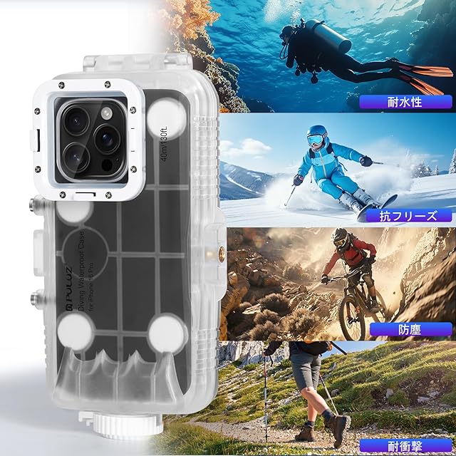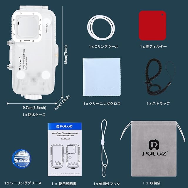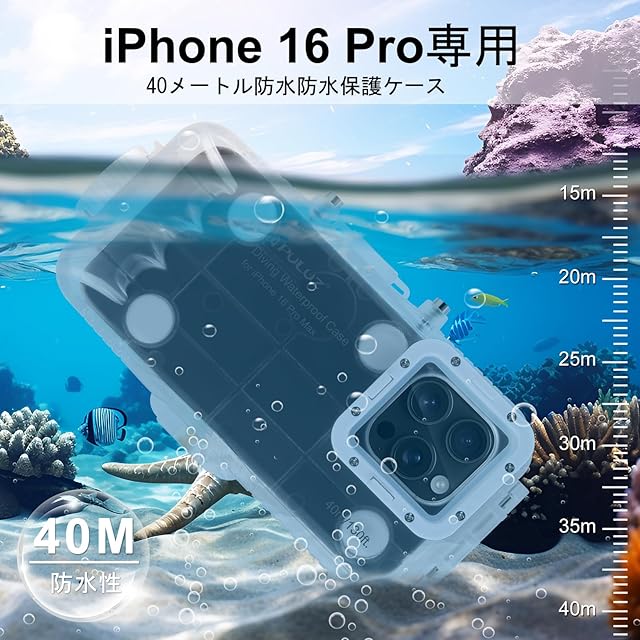<p><b>PULUZ iPhone 16 Pro用 プロ仕様防水ケースの特徴</b></p><p></p><p> あらゆる水中活動に対応</p><p>ダイビング(最大40m)、シュノーケリング、サーフィンはもちろん、スキーや雪中撮影などのウィンタースポーツでもご利用可能。海水・プール・急な雨にも完全防水です。</p><p></p><p> 高画質撮影をサポート</p><p>特殊強化ガラス採用で歪みの少ないクリアな映像を記録。付属の赤フィルターは水深5m以深で自動色補正し、SNS映えする仕上がりに。</p><p></p><p> 徹底した保護設計</p><p>・水深40m相当の水圧に耐える。</p><p>・Oリング+真空密封技術で長期使用でも劣化なし</p><p>・角部分に緩衝材を内蔵し、落下や衝突から守ります</p><p></p><p> 日本ユーザー向け便利設計</p><p>・片手で開閉可能な回転ロック式(日本人の手のサイズに最適化)</p><p>・ストラップ付きで沖縄旅行やマリンスポーツ中でも紛失防止</p><p>・専用クロスでケースの曇りを簡単除去</p><p></p><p> 同梱内容</p><p>防水ケース本体×1、Oリング×1、ストラップ×1、赤フィルター×1、清掃クロス×1</p>