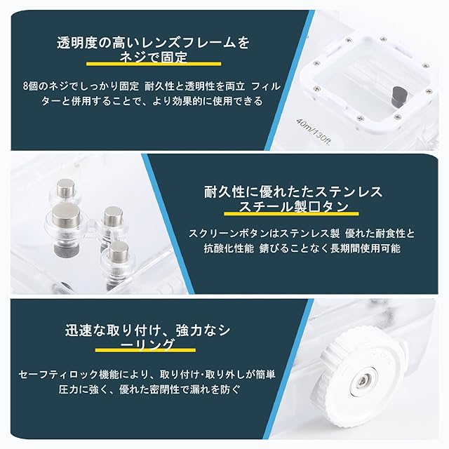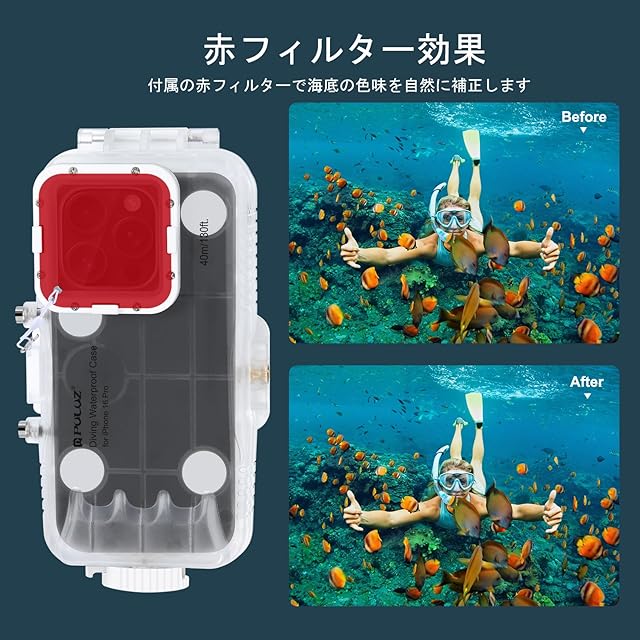 【高画質撮影可能】 強化ガラスと透明PC素材採用で、水中でもクリアな画像・動画撮影を実現。付属の赤フィルターで海底の色味を自然に補正します。