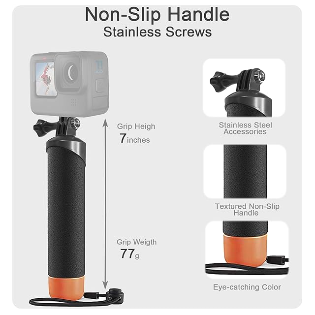【プレミアムフローティンググリップ】グリップのフローティングボディがカメラとアクセサリーを水面に浮かせ、溺れるのを防ぎます。グリップ:高品質の滑り止めフォームグリップは、しっかりとしたグリップと快適な装着感を提供します。ゴムグリップのように日光でベタベタすることもありません。