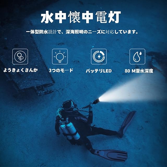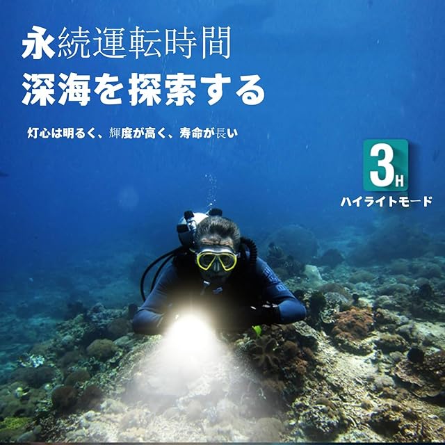 【充電式潜水懐中電灯&耐久性】このIP 68防水潜水懐中電灯は大容量充電式電池を備え、充電(約5.5時間)後、潜水灯は夜間潜水運動に持続的な運転時間を提供することができる。強光モードで3時間、弱光モードで6時間運転する。