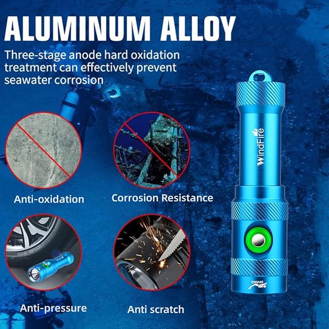 【専門なIP 68防水等級】WINDFIREプロ潜水懐中電灯は高強度航空機級アルミニウムと4 mm高透明コーティング強化ガラスを採用し、設備は3つの防水Oリングを備え、防錆と耐海水腐食、IP 68防水等級は水中100メートルの深さで使用できる。